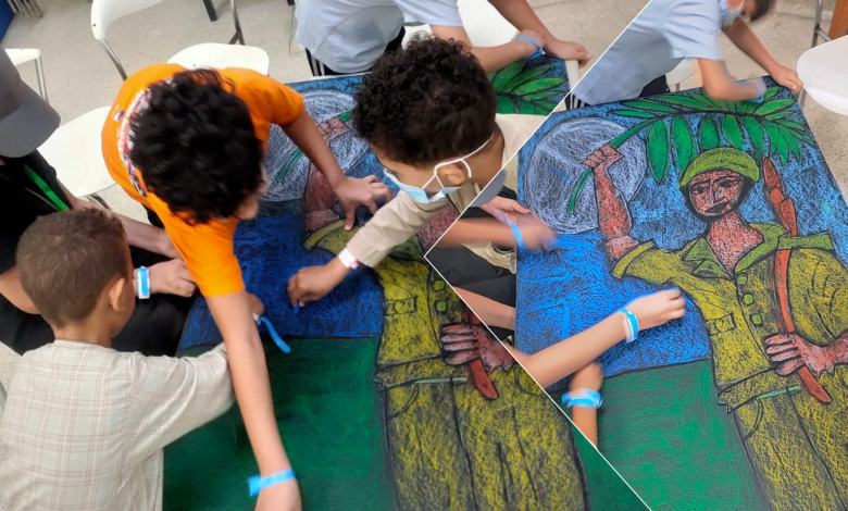 أعقب ذلك ورشة تصميم لوحة جماعية للتعبير عن الصمود والإصرار في استعادة الأرض، بما يرسخ في وجدان الأطفال قيم حب الوطن والانتماء.