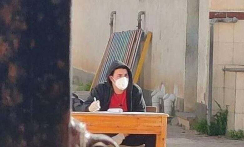 حيث ظهر الطالب أثناء أداء الامتحان امام« دورات مياه المدرسة»، وحيداً ما جعل رواد مواقع التواصل الاجتماعي يتعاطفون معه، بعدما تبين أنه مُصاباً بفيروس كورونا.