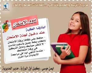 قدَّم أيمن موسى، وكيل أول الوزارة- مدير مديرية التربية والتعليم بالقاهرة، بعض الإرشادات التى يجب إتباعها يوم الإمتحان :-