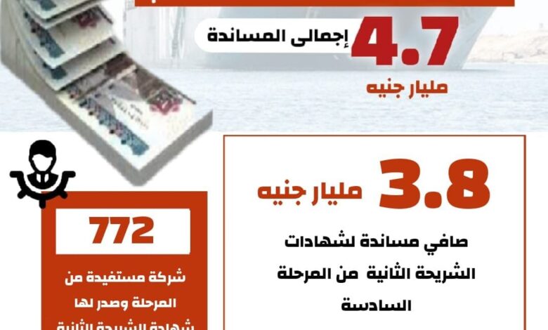 أعلن المهندس أحمد سمير وزير التجارة والصناعة أن صندوق تنمية الصادرات أصدر شهادات الشريحة الثانية من المرحلة السادسة من مبادرة السداد الفوري بإجمالي مساندة 4.7 مليار جنيه وبصافي مساندة 3.8 مليار جنيه وذلك في إطار تنفيذ المبادرة بالتعاون والتنسيق بين وزارة التجارة والصناعة ووزارة المالية.