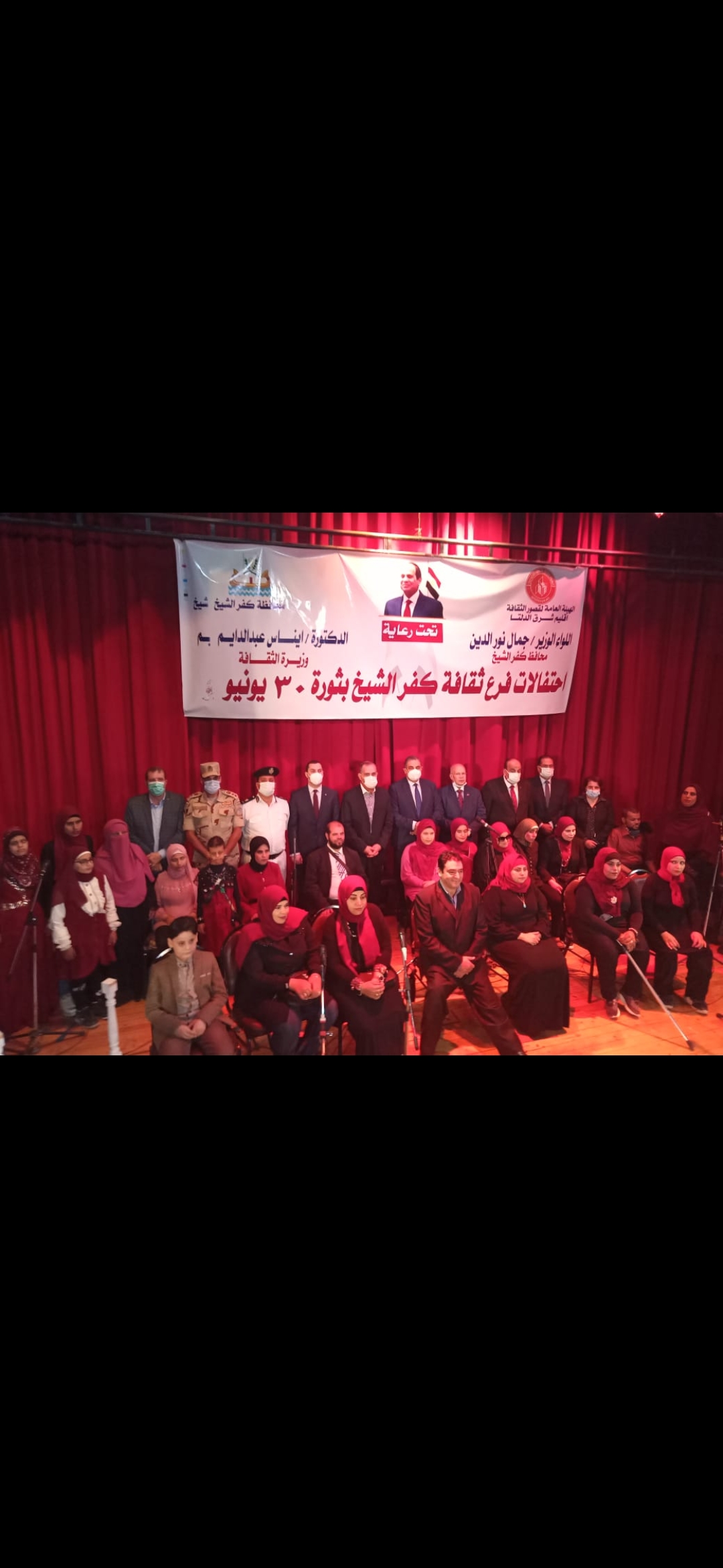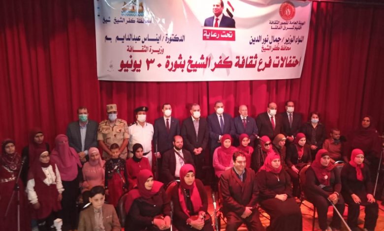 شهد قصر ثقافة كفر الشيخ، الاحتفال بالذكرى الثامنة لثورة 30 يونيو، بحضور اللواء جمال نور الدين ،محافظ كفر الشيخ ، وعمرو البشبيشي، نائب محافظ كفر الشيخ ، والدكتور عبدالرازق دسوقي ، رئيس جامعة كفر الشيخ والعقيد أركان حرب شريف عبد الباري ،المستشار العسكري للمحافظة، واللواء ياسر حفناوي ، السكرتير المساعد للمحافظة، السيد شمس الدين ، عضو مجلس النواب، وعمرو فرج رئيس الإدارة المركزية لإقليم شرق الدلتا الثقافي ، واللواء محمود الكموني ، مساعد مدير الأمن ،والدكتورة جاكلين بشرى ، وكيل وزارة الثقافة ،والدكتور عبدالناصر الشهاوى ، رئيس الإدارة المركزية للمنطقة الأزهرية، وعدد من القيادات الشعبية والتنفيذية وطلاب وطالبات المدارس.
